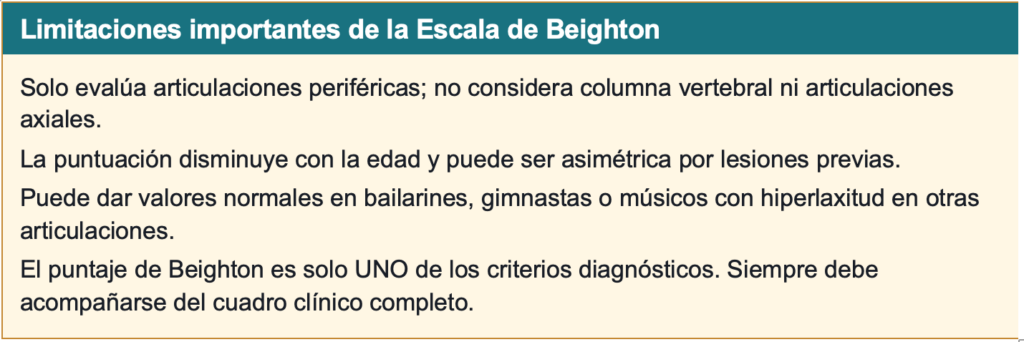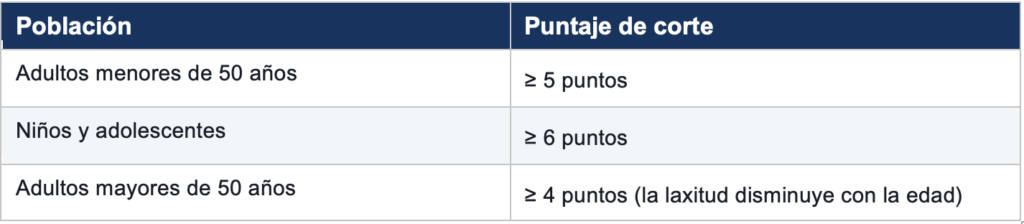 Esta escala puntúa cinco maniobras articulares sobre un máximo de 9 puntos. Se considera positiva para hiperlaxitud generalizada si se alcanzan los siguientes umbrales: