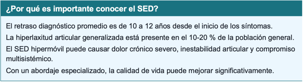 Existe además el Trastorno del Espectro de Hipermovilidad (TEH), una entidad clínicamente similar al hSED pero que no cumple la totalidad de los criterios diagnósticos. Ambas condiciones forman parte de un continuum: en un extremo, la hiperlaxitud articular asintomática; en el otro, el hSED con carga de enfermedad severa y compromiso multisistémico.