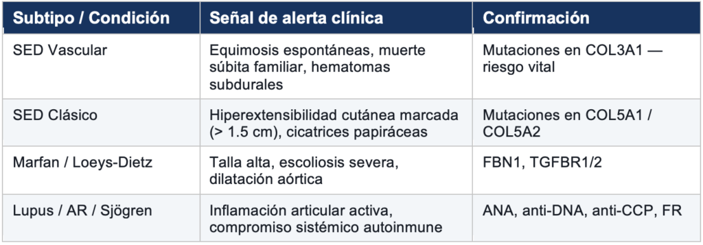 Antes de confirmar el diagnóstico de hSED es indispensable descartar otros subtipos de SED y enfermedades del tejido conectivo. Algunos requieren confirmación genética urgente: