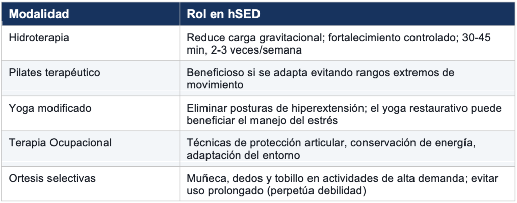 La rehabilitación es la intervención con el nivel de evidencia más alto en hSED y TEH, superior a cualquier tratamiento farmacológico aislado. Su objetivo central es optimizar el control neuromuscular y la estabilidad articular dinámica, compensando la laxitud ligamentaria intrínseca.