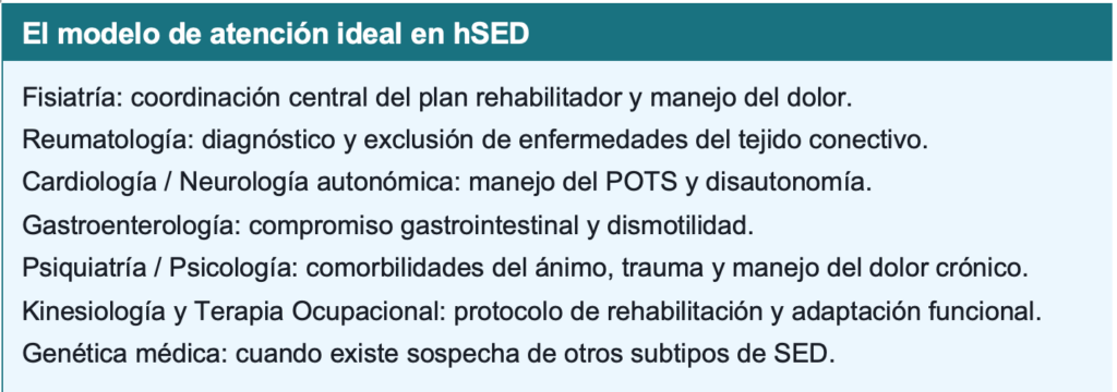 El hSED es mucho más que una enfermedad articular. Las manifestaciones extrararticulares frecuentemente dominan el cuadro clínico y determinan la calidad de vida del paciente. El manejo integral debe abordarlas en paralelo.